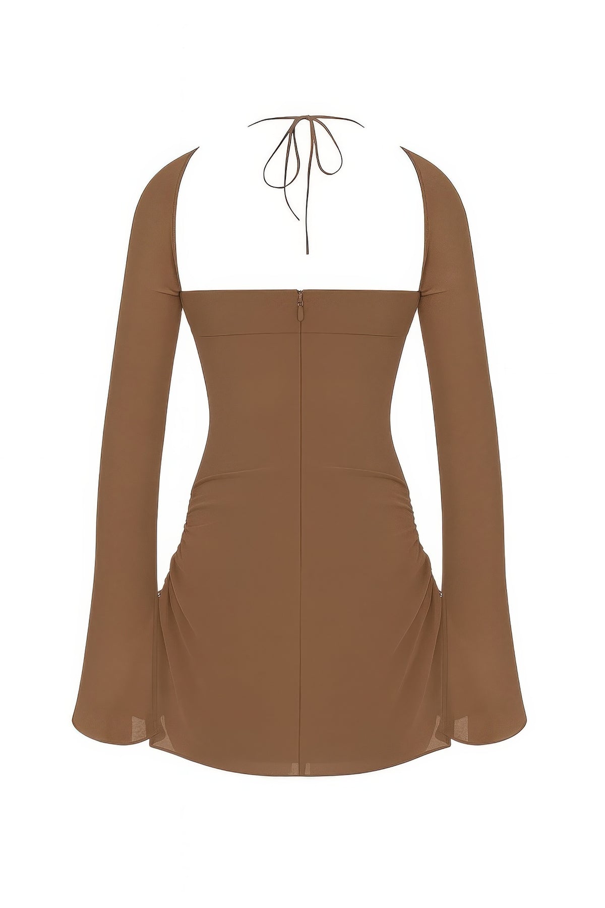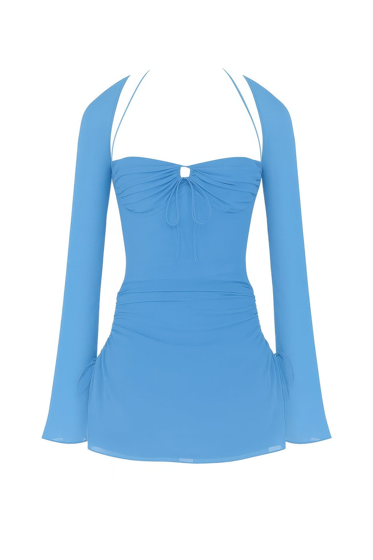 Make a bold and elegant statement with this peek hole mini dress, designed to turn heads with its sleek silhouette and daring details. Featuring a halter neckline and long sleeves with flared ends, it delivers the perfect balance of sophistication and allure. The side peek holes and slits add a touch of sensuality, while the non-stretch fabric maintains a refined, structured fit. Perfect for evening events or special nights out, this dress embodies modern glamour with a confident edge.